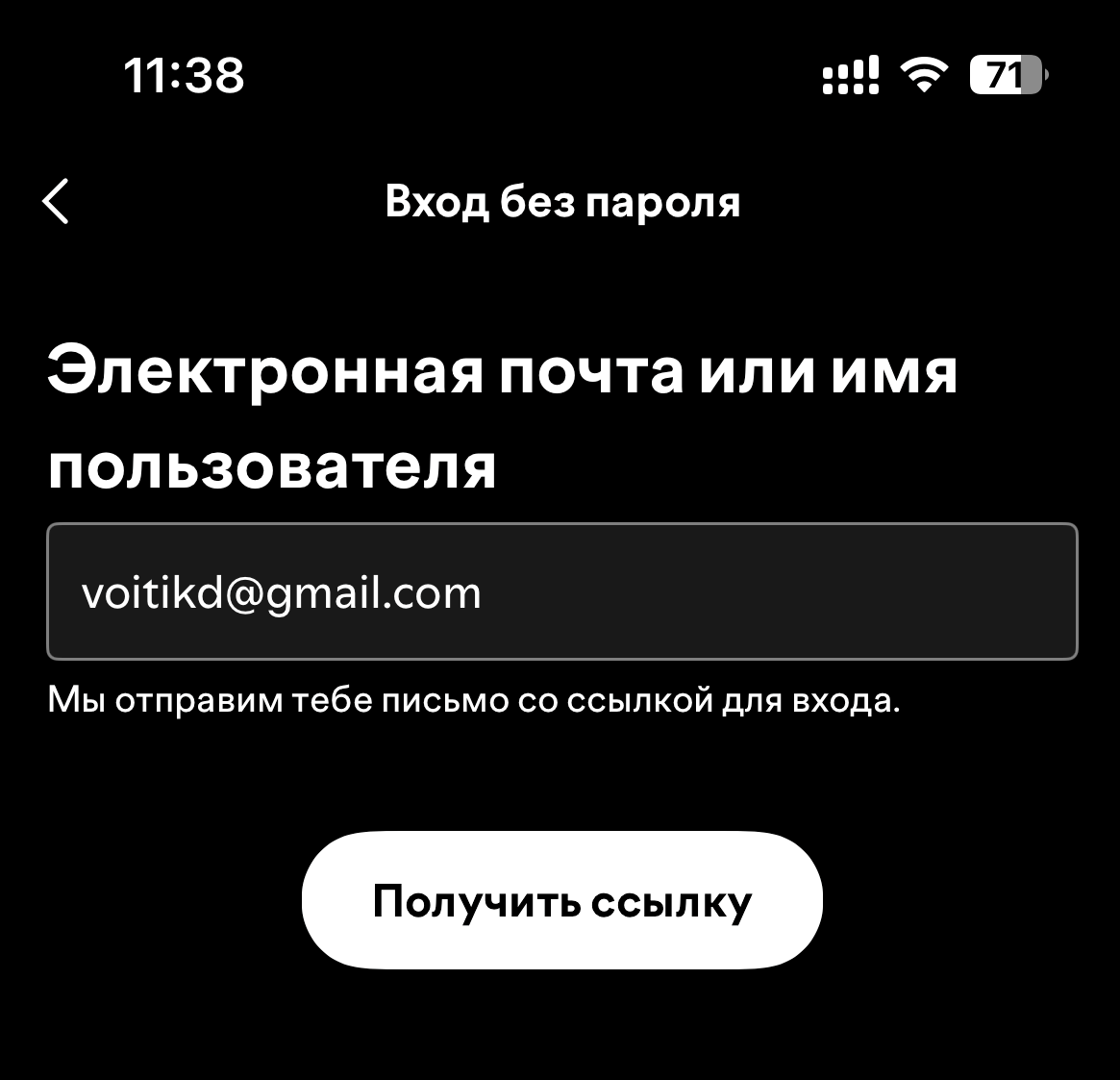 На странице входа в мобильное приложение Spotify нажми на кнопку «Вход без пароля». Введи email своего аккаунта и нажми «Получить ссылку».